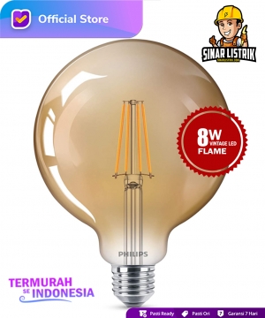 – Philips Vintage LED Flame 8W G120 E27 adalah lampu yang berbentuk globe yang elegan dan Kaca kecoklatan khas vintage